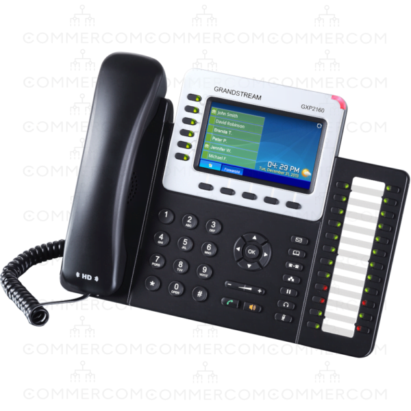 GXP2160 є бездоганно спроектованим бізнесом IP-телефоном, що підтримує до 6-ти ліній, і оснащений кольоровим РК-дисплеєм з діагоналлю 4.3 дюйма (480×272), п’ятьма XML програмованими контекстно-залежними клавішами, 24 вбудованими BLF клавішами, двома портами GigabitEthernet з підтримкою PoE, вбудованим Bluetooth, підтримкою режиму конференції до 5 учасників учасників, а також підтримкою пристроїв електронного зняття трубки (EHS). Забезпечує: HD-якість звуку; великий набір передових функцій телефонії; персоналізовану інформацію та службу додатків; автоматизовану ініціалізацію, для спрощеного розгортання; покращений захист і широку сумісність з більшістю SIP-пристроїв та провідних платформ SIP/NGN/IMS. Ідеально підходить для підприємств малого та середнього бізнесу, GXP2160 є потужним IP-телефоном з кольоровим екраном, для користувачів, яким необхідно обробляти великий обсяг дзвінків.